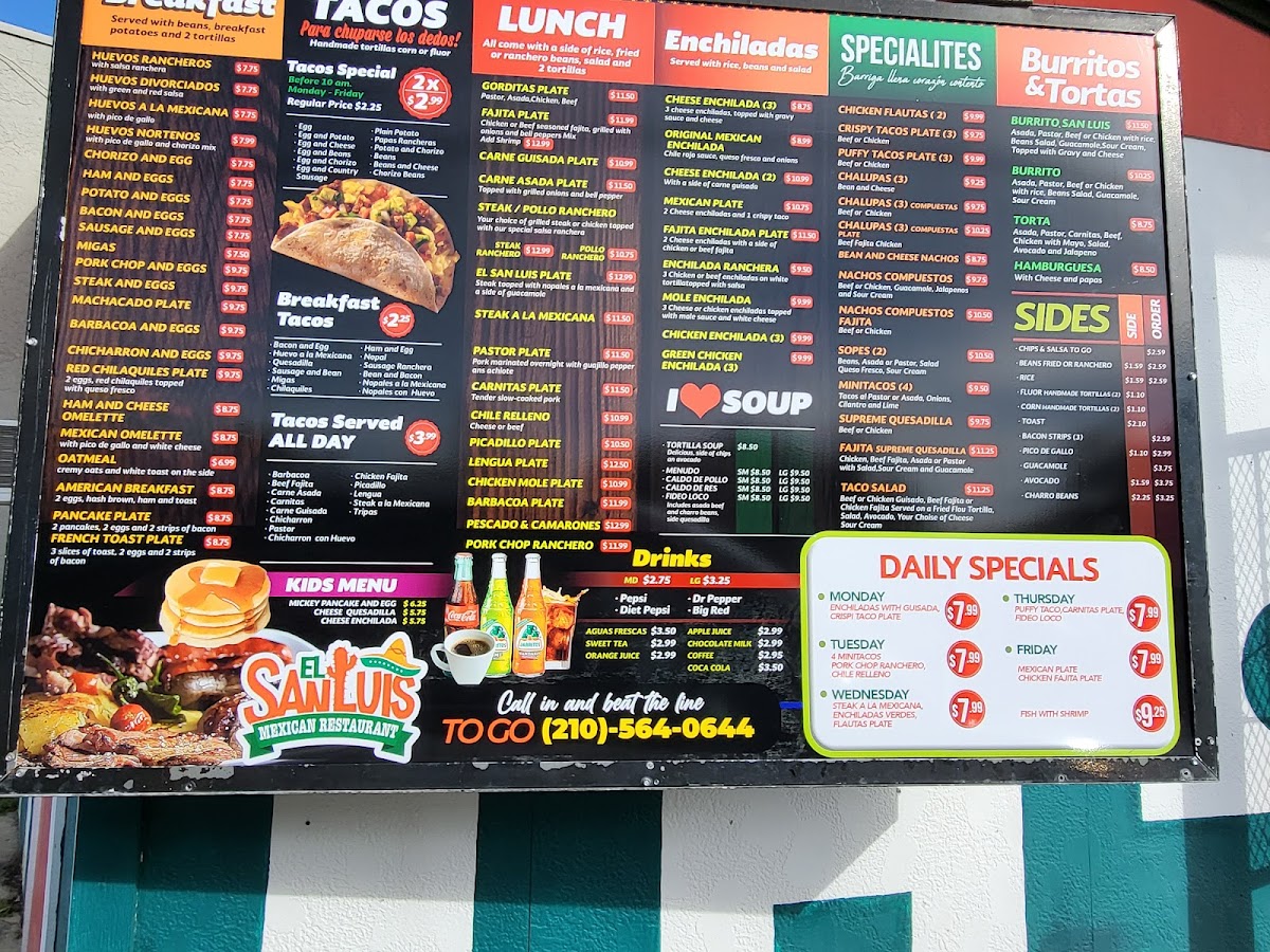 Welcome to El San Luis Mexican Restaurant, a true gem located in the heart of San Antonio. Known for its authentic and flavorful dishes, this restaurant provides an inviting atmosphere where guests can enjoy a taste of tradition. The menu offers a delightful array of options available throughout the week.